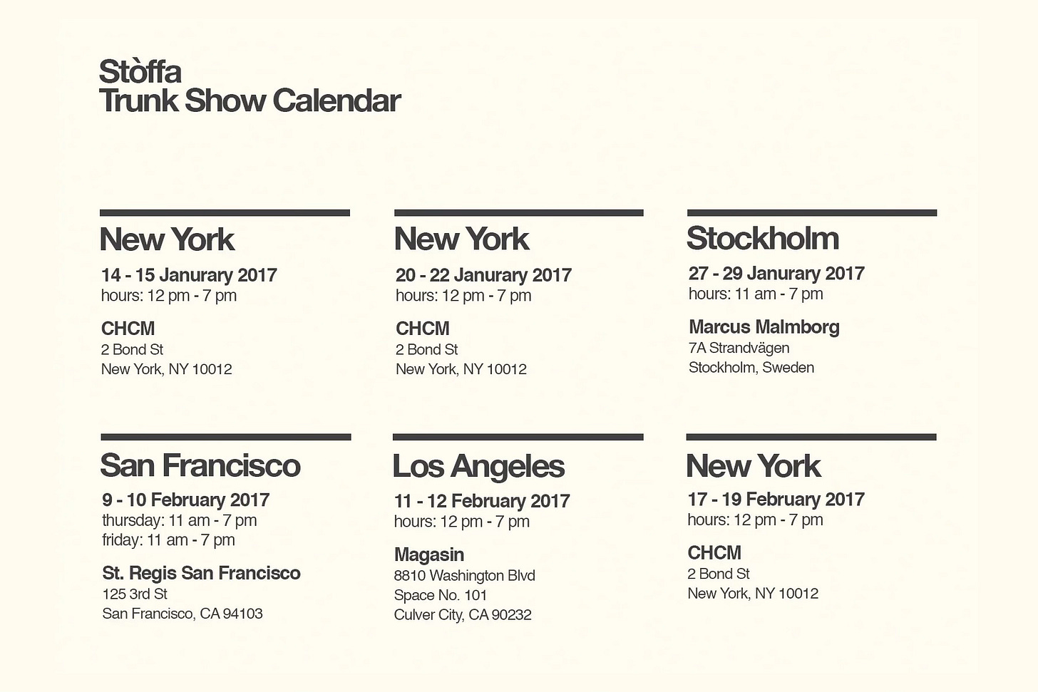 2015–2016: The brand rolls out made-to-measure outerwear and trousers, merging old-world tailoring with a direct-to-consumer model. Monthly trunk shows in NYC, L.A., and even Stockholm cultivate a devoted initial client base. Stòffa eschews the traditional seasonal calendar – new designs are added thoughtfully rather than in frenetic seasonal churn.